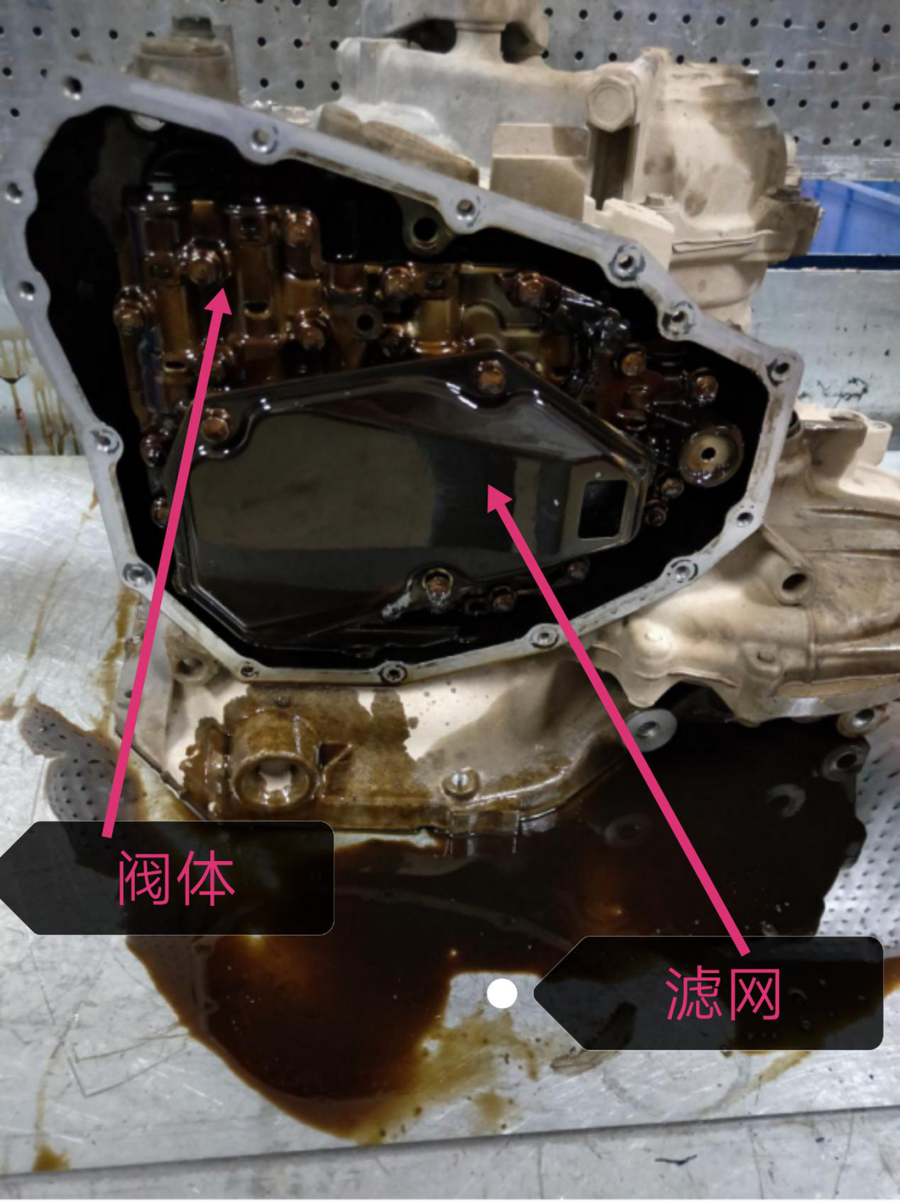 来张近照,看着这一摊恶心的油,拍照凑近点是一股恶心的臭味,漏出来内件都染色了。正规的变速箱油是不会导致这种情况