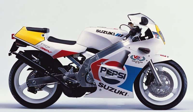 真正仿赛车款的鼻祖-Γ在1988年进化到第二代,最关键的引擎部分搭载了90度的V型双缸引擎,甚至还配备了众多当时最新颖的配备,包括为了增强低中转速时的扭力,在一个气缸有两个排气装置,以及采用箱型结构的铝合金钻石骨架等,惊人的高转速马力也让RGV250Γ拥有「悍马」的爱称,而Kevin Schwantz的个人涂装配色也魅力十足。