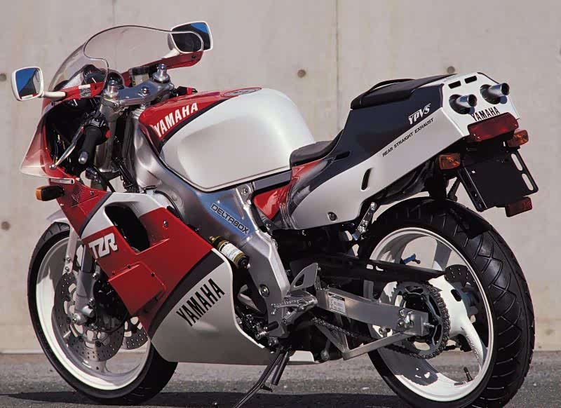 ▲在1989年改款登场的TZR250,249cc的水冷式二行程并列双缸引擎可以提供45ps与37Nm的动力数据。