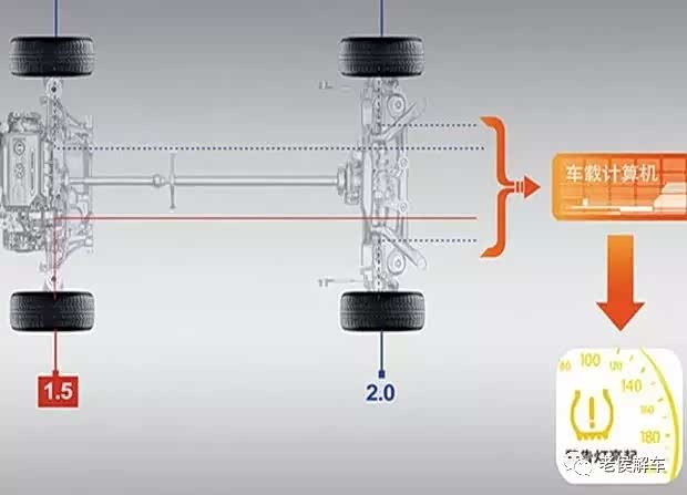 我们都知道当一个轮胎缺气的时候它的周长就会发生改变,所以说轮速传感器可以分析出4个轮胎转速的差别。当某个轮胎的气压降低时,车辆的重量会使该轮的滚动半径将变小,导致其转速比其他车轮快,当差别很大时行车电脑就会发出胎压异常报警。间接式轮胎报警系统实际上是ABS系统的扩展功能。