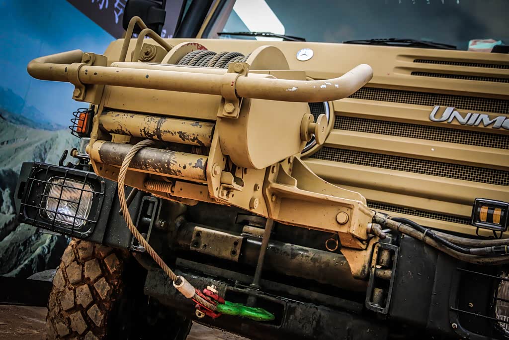 作为救援车而言,大部分可能是救援陷车等一些极限情况,一个强大而有力的绞盘就是救援与被救援的重要配置。这辆乌尼莫克救援车的绞盘是个军用的液压绞盘,牵引力达到了50千牛,回收绳速10米/分钟,工作压力160巴,缆绳直径14毫米,最大长度50米,最小制动载荷137千牛,简单地说拖拽个装甲车没问题。