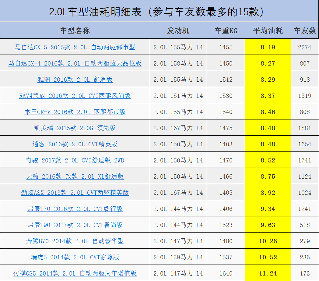 上面两张表,一张是1.5T的主流车型(参与调研的车友数前15名)油耗排名,另一张是2.0L的主流车型(参与调研的车友数前15名)油耗排名。