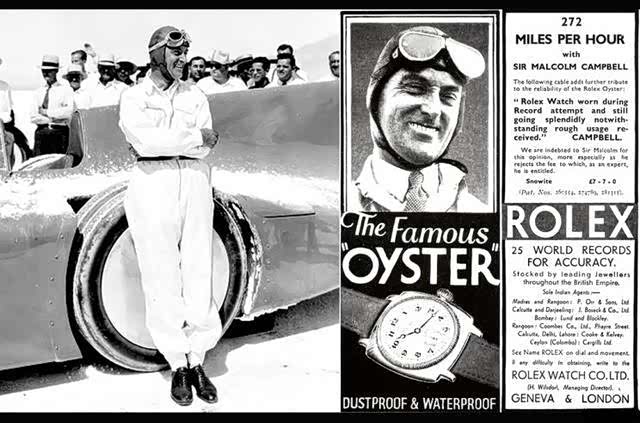 此后,手表厂商仿佛嗅到了借着比赛来宣传的商机,第一个吃螃蟹的手表厂商就是我们熟知的劳力士,1930年,英国赛车手Malcolm Campbell打破了陆地速度记录,报纸上他手上佩戴的是劳力士蚝式腕表,也就是现在蚝式恒动系列的前身。之后,手表和汽车品牌正式开启了合作的时代。