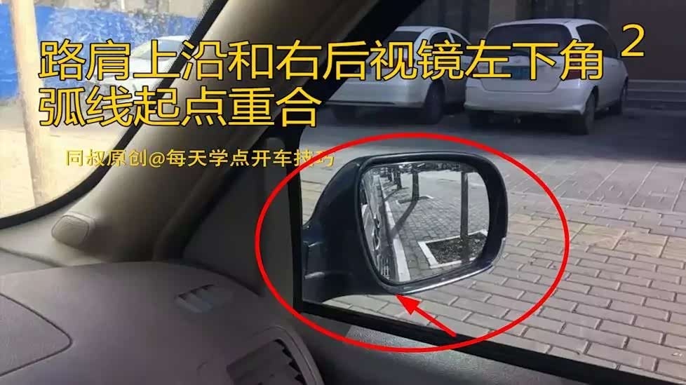 看图一、图二,靠右路边停车时,正常驾驶坐姿目视通过前风挡中心点刚好看到路肩上沿,此时车身距路肩距离25厘米,通过右侧后视镜观测效果,可以看到路肩上沿刚好和右后视镜左下角弧线起点重合。通常情况下保持这个距离刚好,因为侧方位路边停车,出车时如果距离路肩太近打方向就容易挤到轮胎。