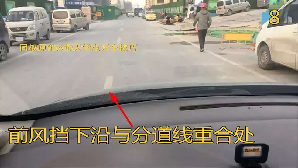 看图八、图九,通过前风挡下沿标记点判断左侧车轮的位置。正常驾驶坐姿,目视前方可以看到前风挡下沿距离左下角大约30厘米处,此时你的左边轮胎刚好压线。