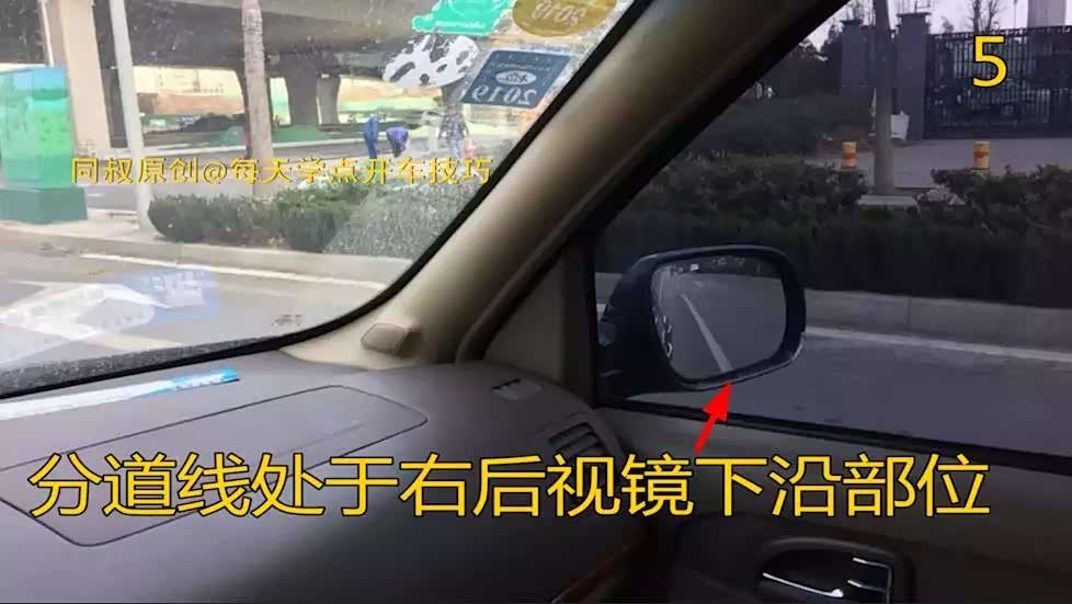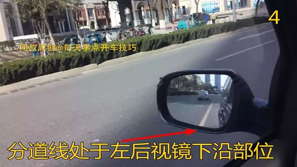 看图四、图五,可以通过观察左、右后视镜进行验证,从左、右后视镜下沿可以看到分道线基本处于后视镜下沿的接近中间部位。