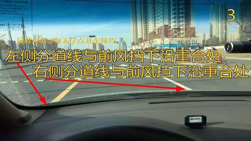看图三,行车道中央行车,正常驾驶坐姿,看左边分道线处在前风挡下沿靠左边12厘米处重合,看右侧分道线处与前风挡下沿中心点处重合,此时车身左右距离分道线均为70厘米,车子刚好在中间。