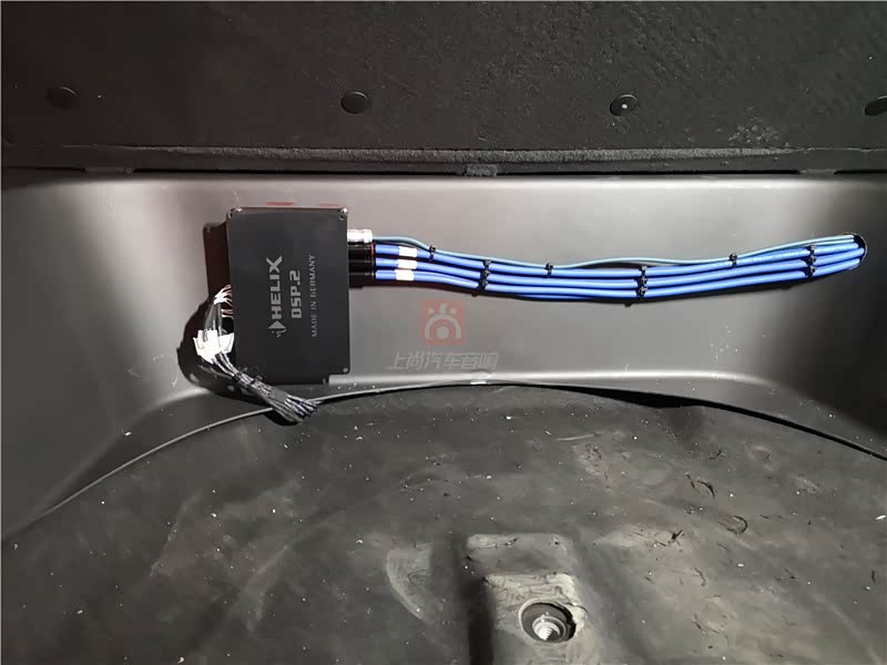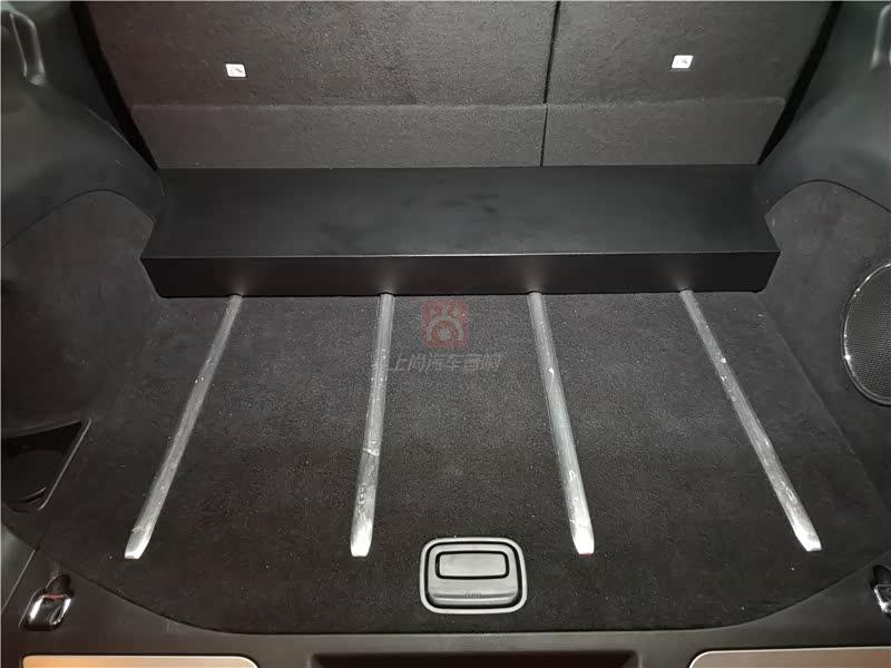 为了不影响到后备箱的储物空间和美观性,两台功放放置在制作的箱体下隐藏安装,既节约了空间同时也便于日常的维护。