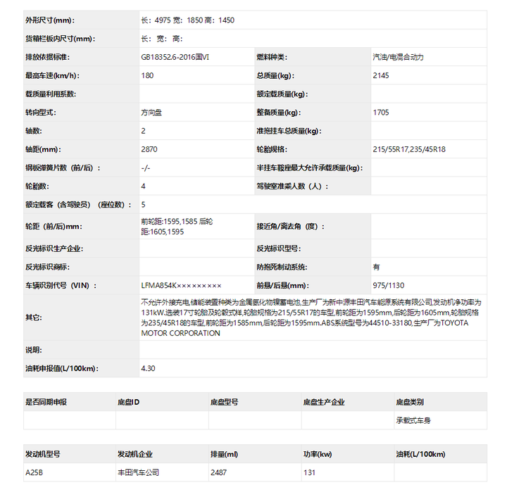 此前,一汽丰田旗舰车型亚洲龙在广州车展中正式发布并开启预售,新车的定位与皇冠同级,由一汽丰田国产销售,外观上十分大气,尾部有着运动感十足的双边双出排气布局。前不久工信部公布了亚洲龙2.5L燃油版车型搭载型号为A25A的自然吸气发动机,尚未透露混合动力系统。近日,行车视线通过工信部获取一组亚洲龙的申报图,申报图中显示一汽丰田亚洲龙2.5L混合动力系统的信息,其搭载与雷克萨斯ES相同型号A25B的自然吸气发动机,,最大功率为131kW,百公里油耗仅有4.3L。