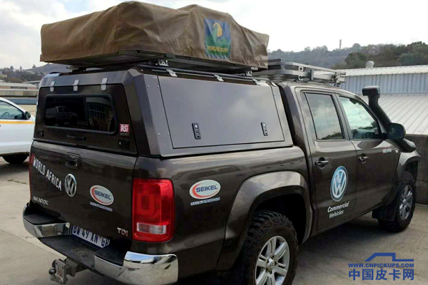 先来看看这台大众Amarok,这台皮卡加了高盖,高盖上面是软顶帐篷,加了帐篷的皮卡更适合长途穿越使用。软顶帐篷在收纳时相对复杂,但是,这样的设计仍然是人们的最爱。