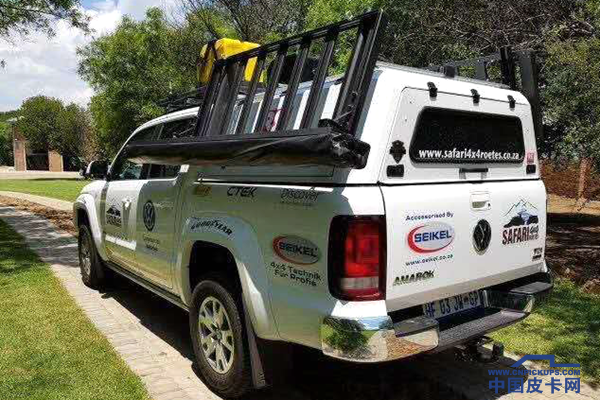 又是一台大众Amarok,此改装的特点是车顶架可以分开,并且下滑到高盖左右两侧,方便拿取上面的物品,简单又实用。