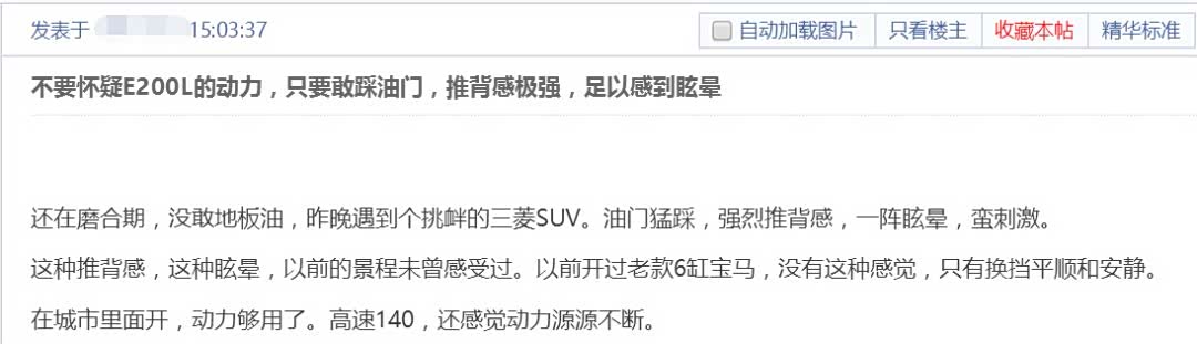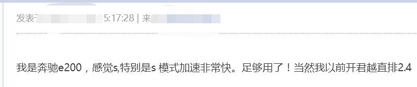 如果理论不足以支持的话,我搜遍了各个论坛,查看了各大E200车主,他们反馈的动力基本都算是优秀和够用之间,基本没有说动力太肉的现象。其实我们也可以试想,这么高端的车型,奔驰官方不至于拿一台坑人的发动机自毁招牌。