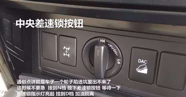 全时四驱系统:值得一提的是,这款车采用的是全时四驱系统。有4HF全时四驱、4HL高速四驱锁止、L4L低速四驱锁止(可放大扭矩2.566倍)。