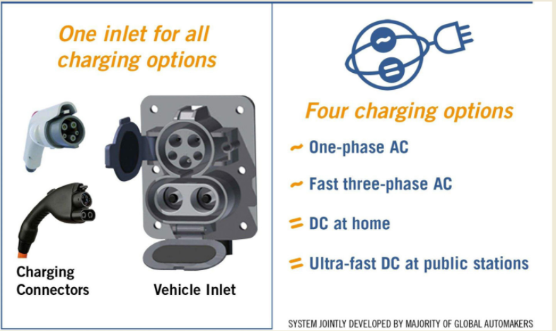 “联合充电系统”可将现行所有充电接口统一起来,这样,用一种接口就能够完成单相交流充电、快速三相交流充电、家用直流充电和超速直流充电四种模式。