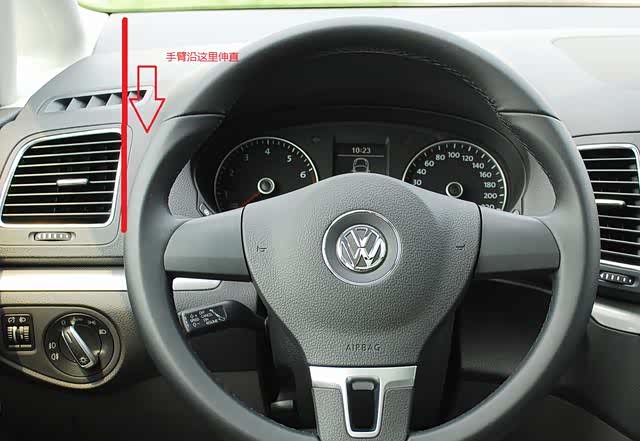 然后我们怎么判断又车轮的位置呢?这个时候我们看方向盘的最右侧,然后用手比一个大概十公分的距离,这个时候我们再伸直手臂,看延长线是不是与地面标志重合,如果重合的话就是压线了,也就是说,我们要保证右车轮不压线,就要确定用手的延长线,在距离方向盘右侧15公分-20公分的时候,仍然不跟地面标志重合,有很多人觉得,这么麻烦,直接看雨刮器不好吗,经过小编的体验,车型不同的话,看雨刮器其实不是太准。