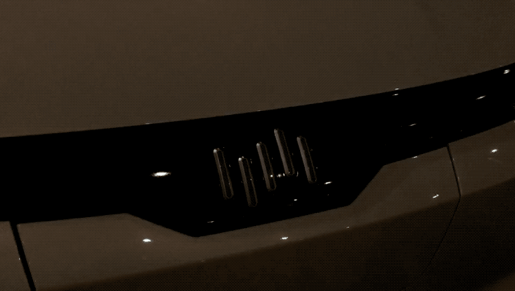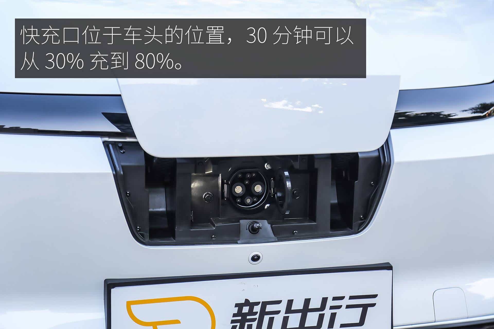 车头 LOGO 下方的盖子打开是快充口,解锁的状态下按一下盖板就可以打开。