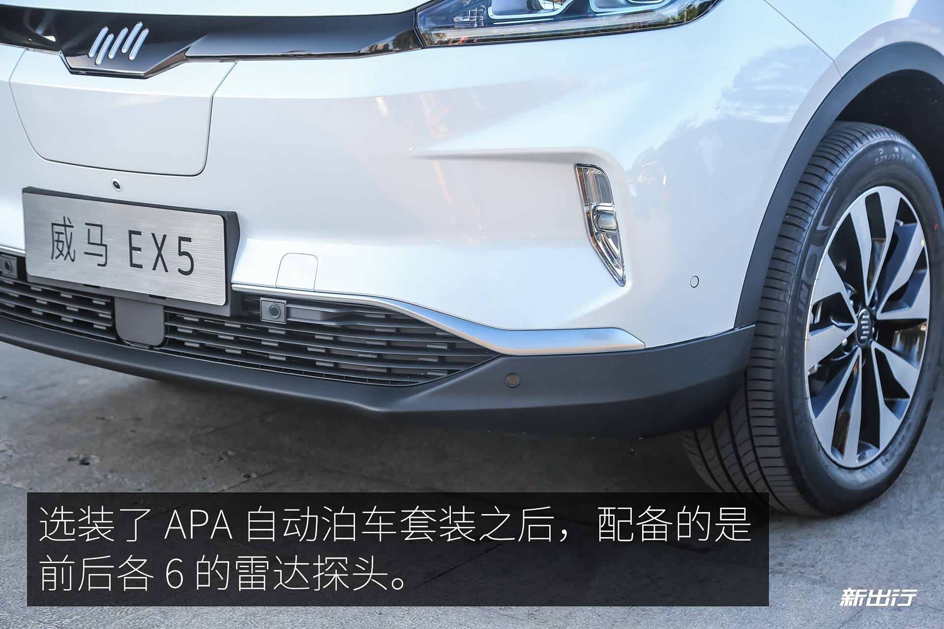 在倒车雷达配置方面,威马 EX5 全系标配的是前后各 4 个雷达探头,这车选装了 APA 自动泊车套件,所以前后配备的是各6 个雷达探头。