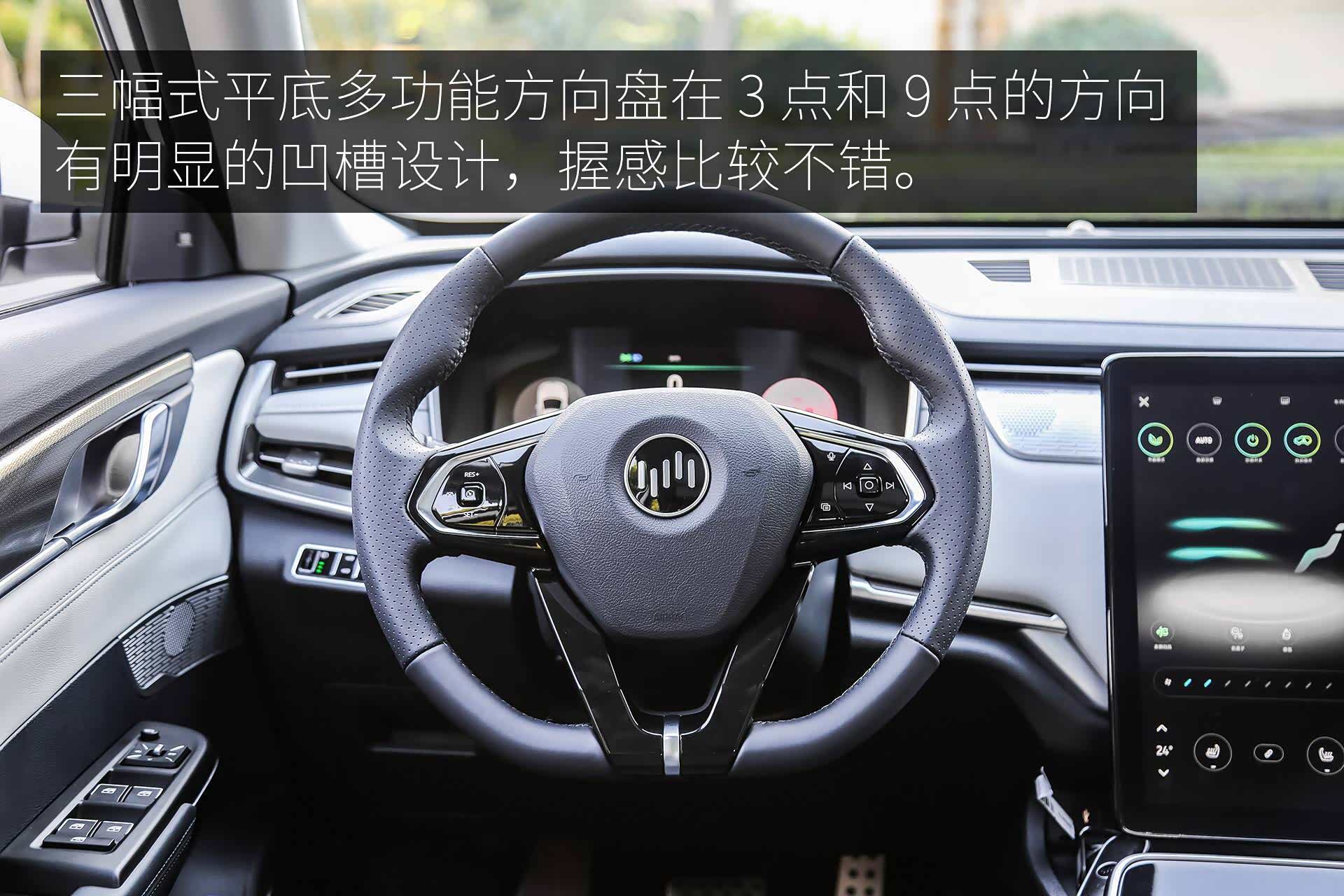 威马 EX5 的内饰通过黑、灰两色的配色和高亮装饰的运用,加上大量的缝线处理,内饰营造出不错的质感。三幅式平底多功能方向盘搭配烤漆材质,很有运动感。中控台的 12.8 英寸液晶大屏可进行旋转,在导航时界面会竖屏展示,如果在停车时使用影院模式,大屏可自动旋转成横屏。除了旋钮式换挡、电子手刹、AUTOHOLD、后备厢开启等常用功能外,其余功能区采用的是触摸操作。