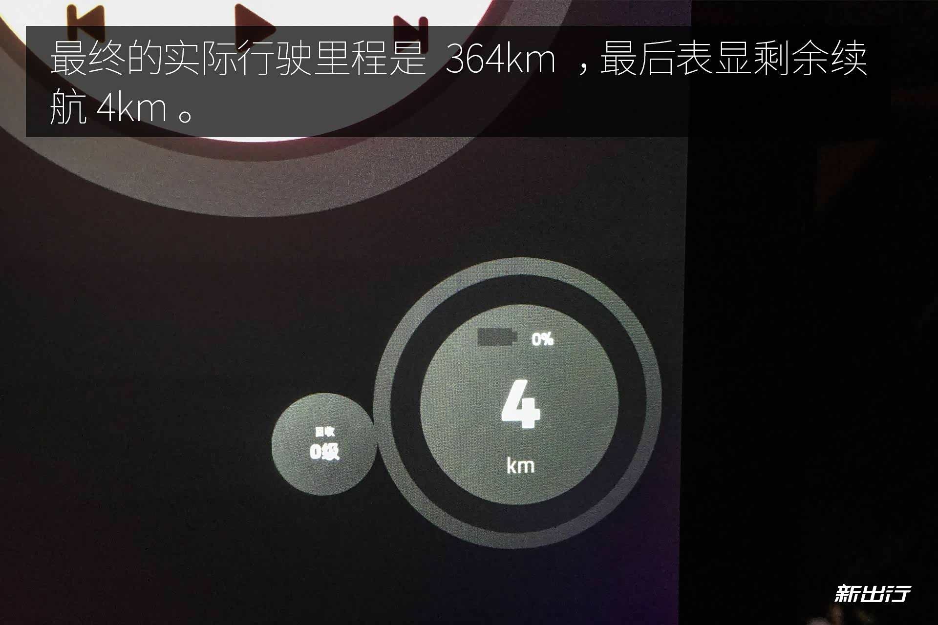 行驶了 364km 后,表显剩余续航 4km ,得到的最终成绩是 368km 。