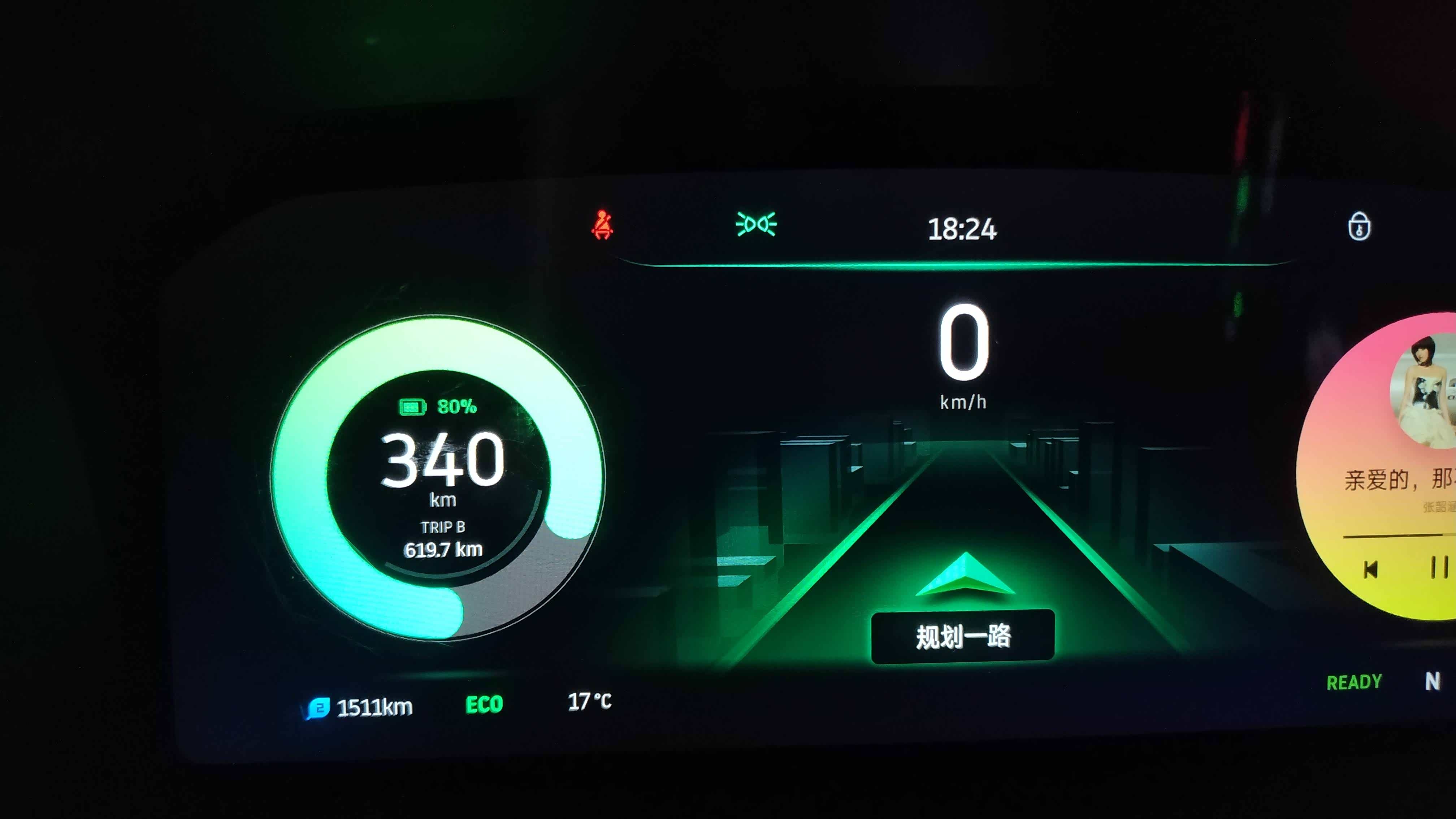 返程后表现剩余里程为 340km ,电量剩余 80%。