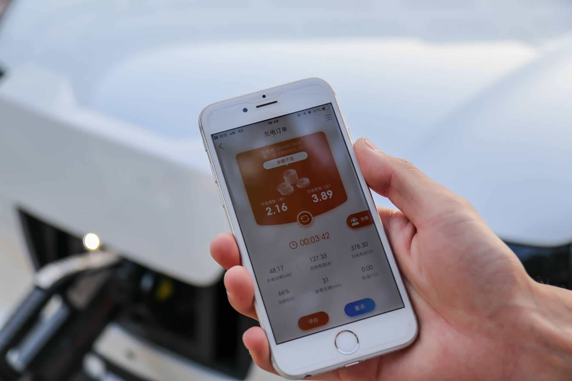 在实测中,威马 EX5 在快充桩上的充电电压大约为 378V、充电电流为 127A 左右,充电功率大约为 47.2kW。此时剩余电量 66% ,显示还需 31 分钟充满。实际上从 0 充满到 100% 总共需要约 1 小时时间。