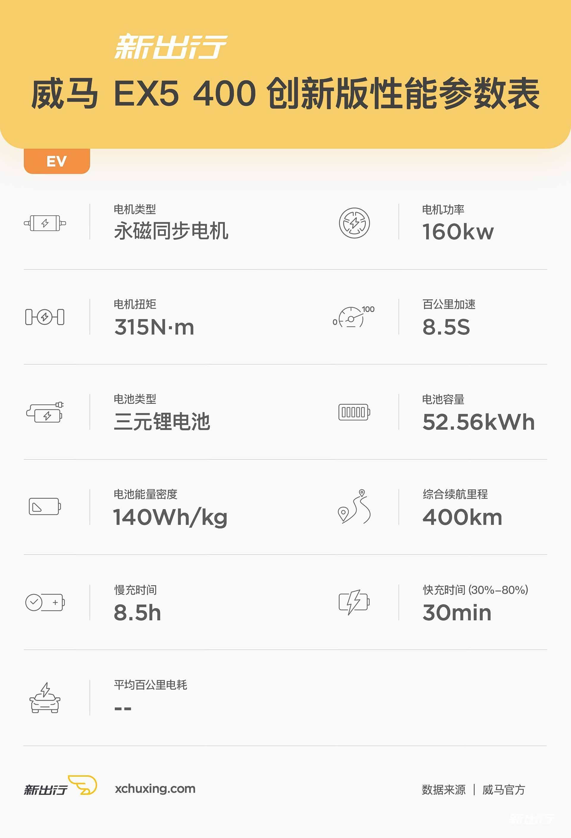 按照威马公布的信息,EX5 在快充状态下 30 分钟可以从 30% 充至 80%;而在慢充状态下,300 版本慢充时间需要 7.5 小时,400 的版本充满的时间需要 8.5 小时,500 的版本充满需要 9.2 小时。