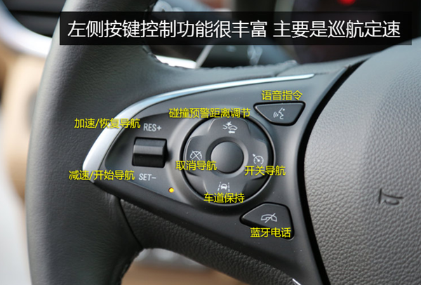 别克gl8多功能方向盘图解如下,别克gl8多功能方向盘是指在方向盘两侧或者下方设置一些功能键,包括音响控制、车载电话等等,还有的将定速巡航键也设置在方向盘上。