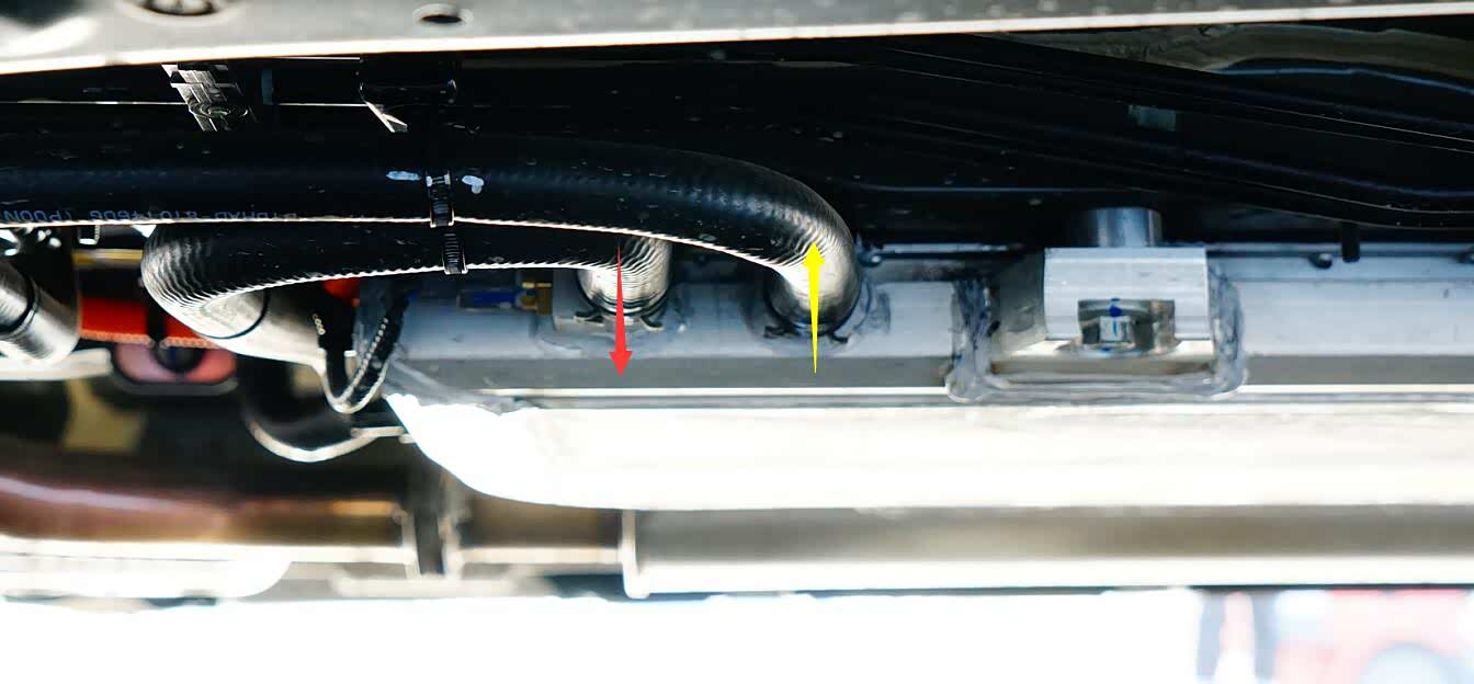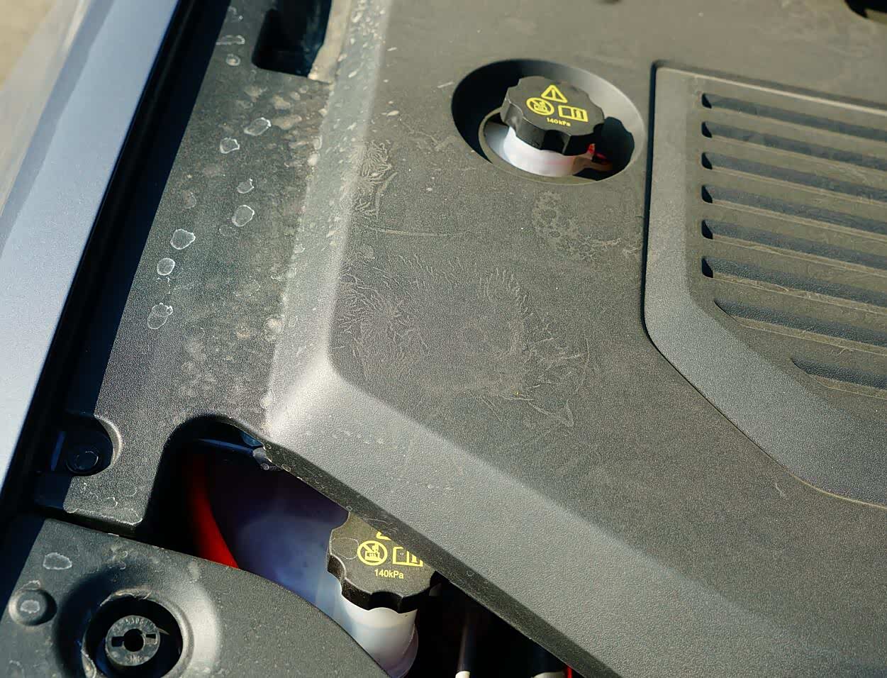 上图为秦Pro DM搭载的“T”型三元锂动力电池靠近前副车架一端的液态热管理系统“进出水”接口细节特写。