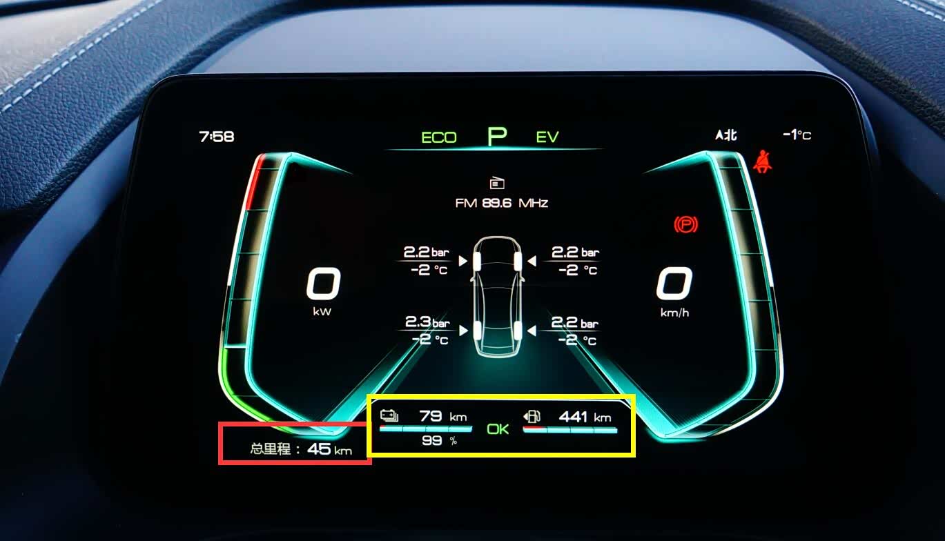 首先以EV+ECO模式行驶,百公里电耗约为5度电;转为HEV+ECO模式行驶,百公里油耗约为5.2升。此时北京室外温度约为3摄氏度,迎着阳光照射方向行驶,车内未开启暖风。