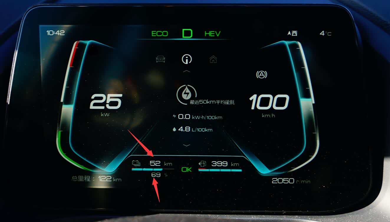 EV+ECO模式行驶表显122公里(实际行驶里程为122-45=77公里)后,电驱动剩余续航里程52公里,SOC值为69%。至此,笔者进入HEV+ECO模式行驶。