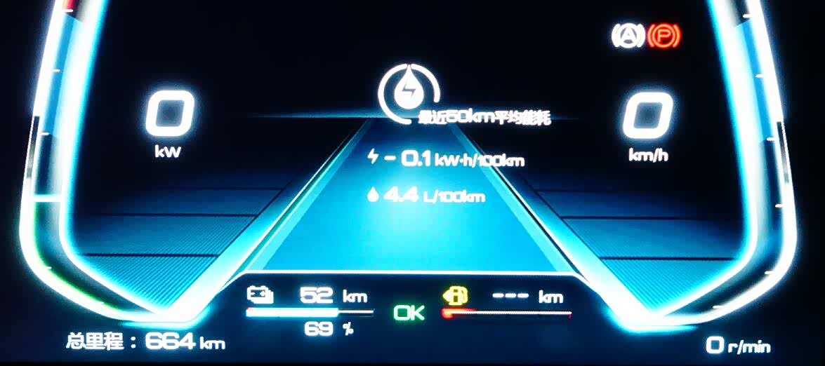 表显行驶总里程664公里(实际行驶里程为664公里-45公里=619公里),全电驱动续航里程为52公里(SOC值为69%),燃油续航里程为XX公里。