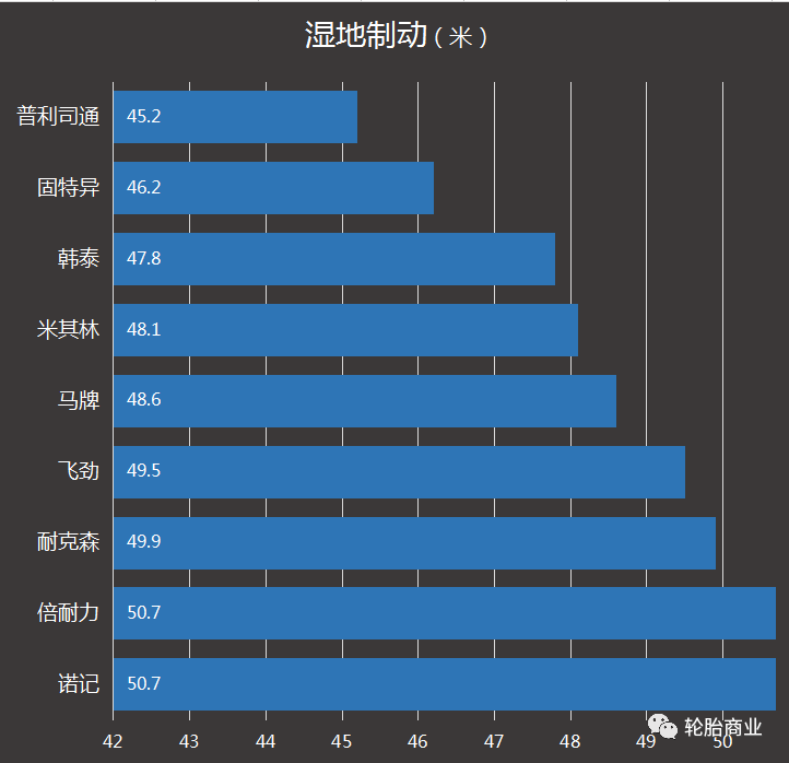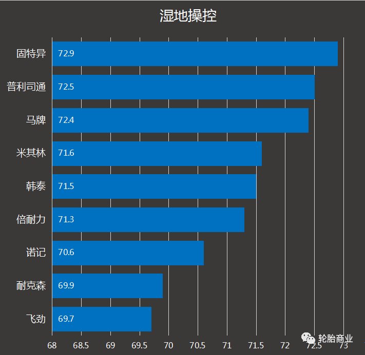 在湿地测试中普利司通也明显处于优势,湿地制动排名第一;湿地操控位于第二。米其林的湿地性能中等偏上。