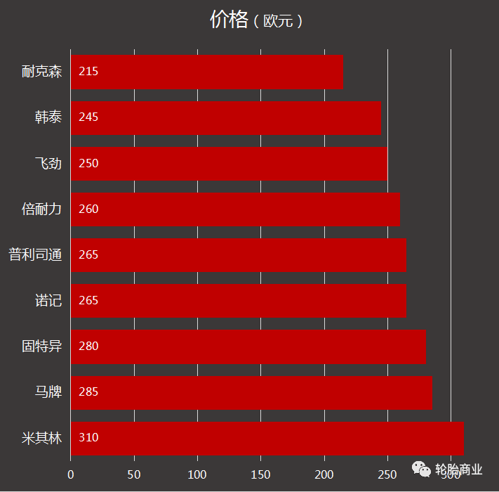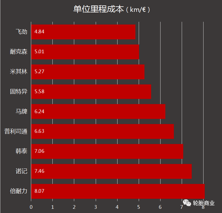 米其林的磨损里程最长,但性价比最高的是飞劲,1000公里的成本为4.84欧元,普利司通处于中等水平。