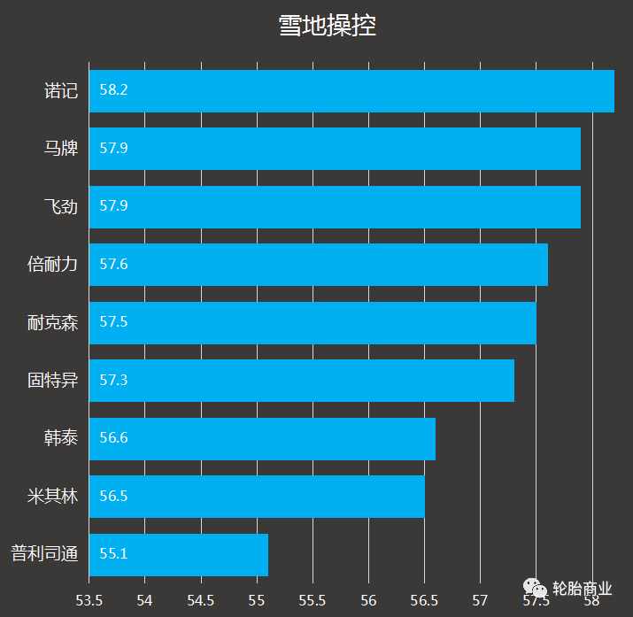 虽然普利司通在干地和湿地性能优越,但在雪地测试中遭遇了滑铁卢,无论是制动还是操控性能都是最后一名。诺记轮胎在雪地性能中体现了较大的优势,马牌轮胎实现了湿地和雪地性能平衡。