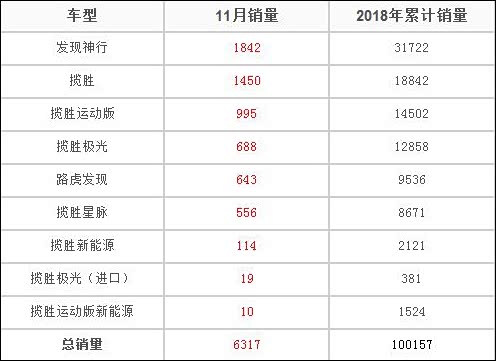 销量同比大幅下跌,这是近期捷豹路虎在中国市场的“主旋律”,从数据公司发布的终端销量数据来看,2018年11月路虎品牌在华终端销量6317辆,今年1~11月累计销量100157辆。作为一个专注SUV的豪华品牌,在华年销量超过10万辆是一个可以被接受的成绩。