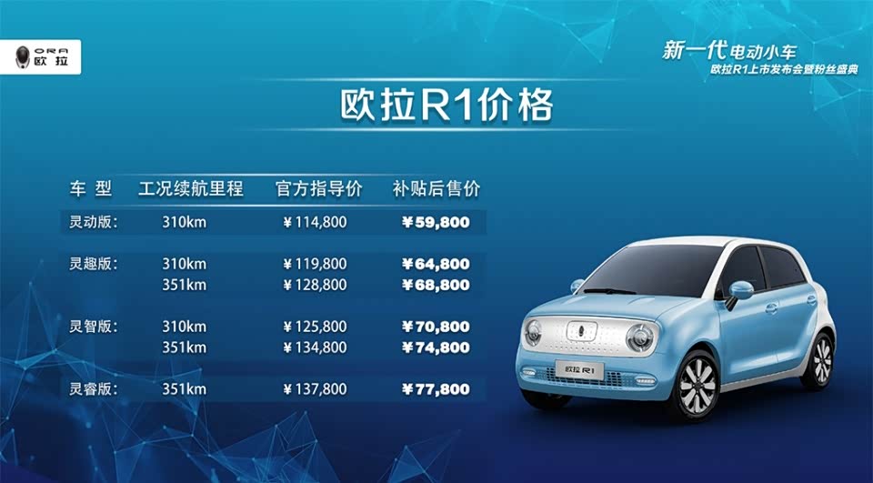12月26日, 欧拉R1开始上市销售,此次上市共推出6款不同配置车型,不计补贴前的官方指导价为11.48万-13.78万元,减去补贴政策后售价5.98-7.78万元。欧拉R1并不会出现只上市不实际交车的情况,首批欧拉R1将于2019年1月交付到消费者手中。
