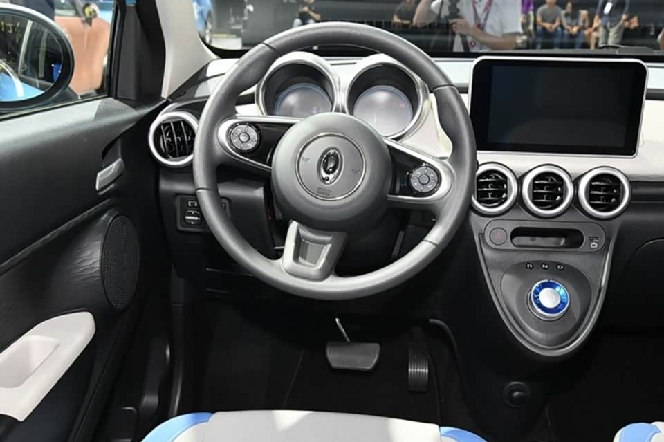 与许多纯电动车走科技风有所不同的是,欧拉R1的设计将复古和可爱结合。R1使用了蓝白双色搭配的车身颜色,圆圆的车灯采用了LED光带作为光源,让人觉得小巧可爱。同时,四开孔式低风阻的轮圈造型,极短的前后悬比例也让欧拉R1有着浓浓的复古风。