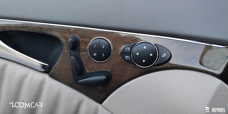 座椅调节按钮布置在门板上,是奔驰一贯的设计,具有3组记忆。倒车镜的调节和折叠按钮也设置在门板上,操作很清晰。