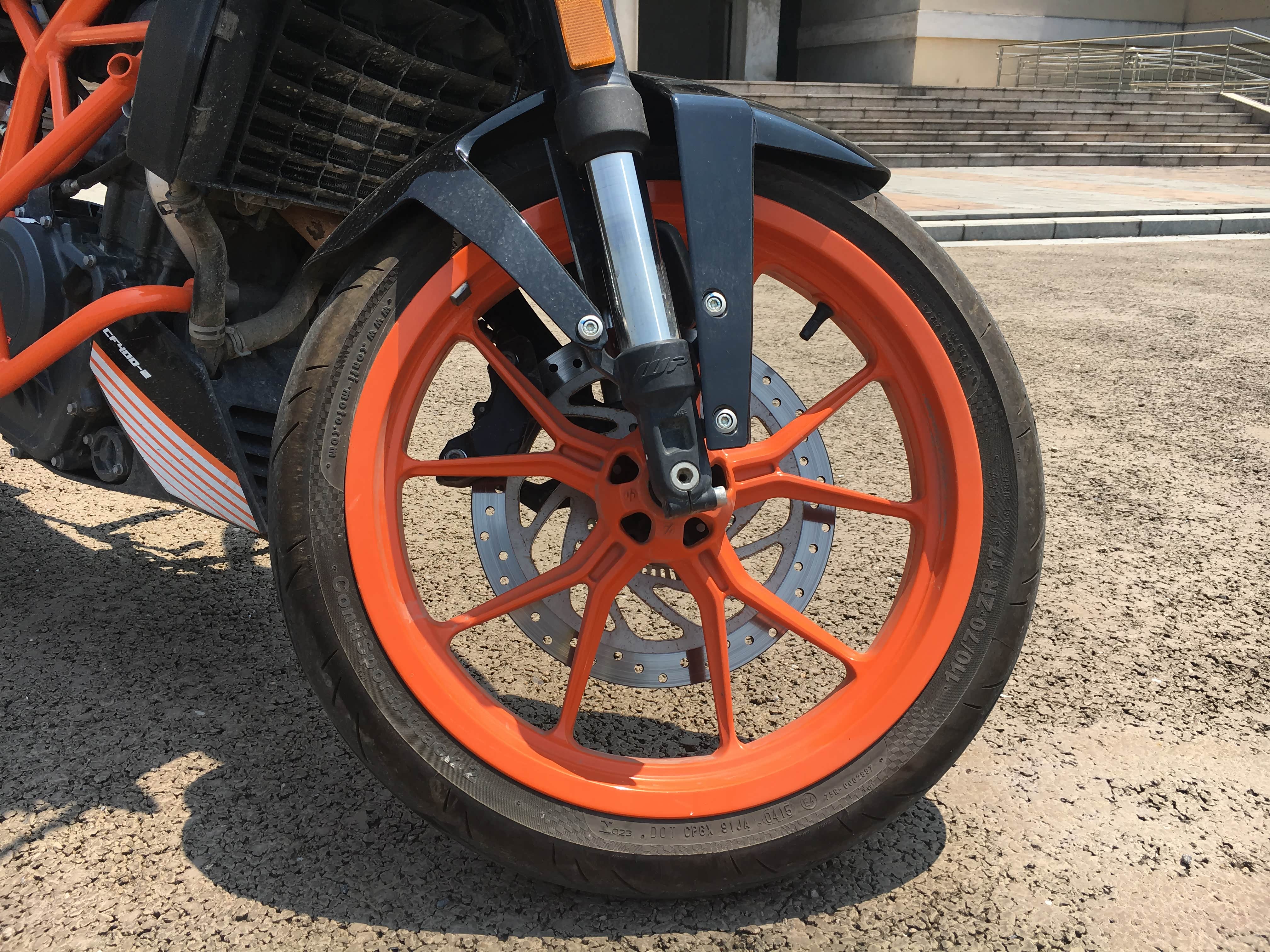白色涂装的390采用的是橙色轮胎,细密的辐条看着挺有力量感,也有利于减重。