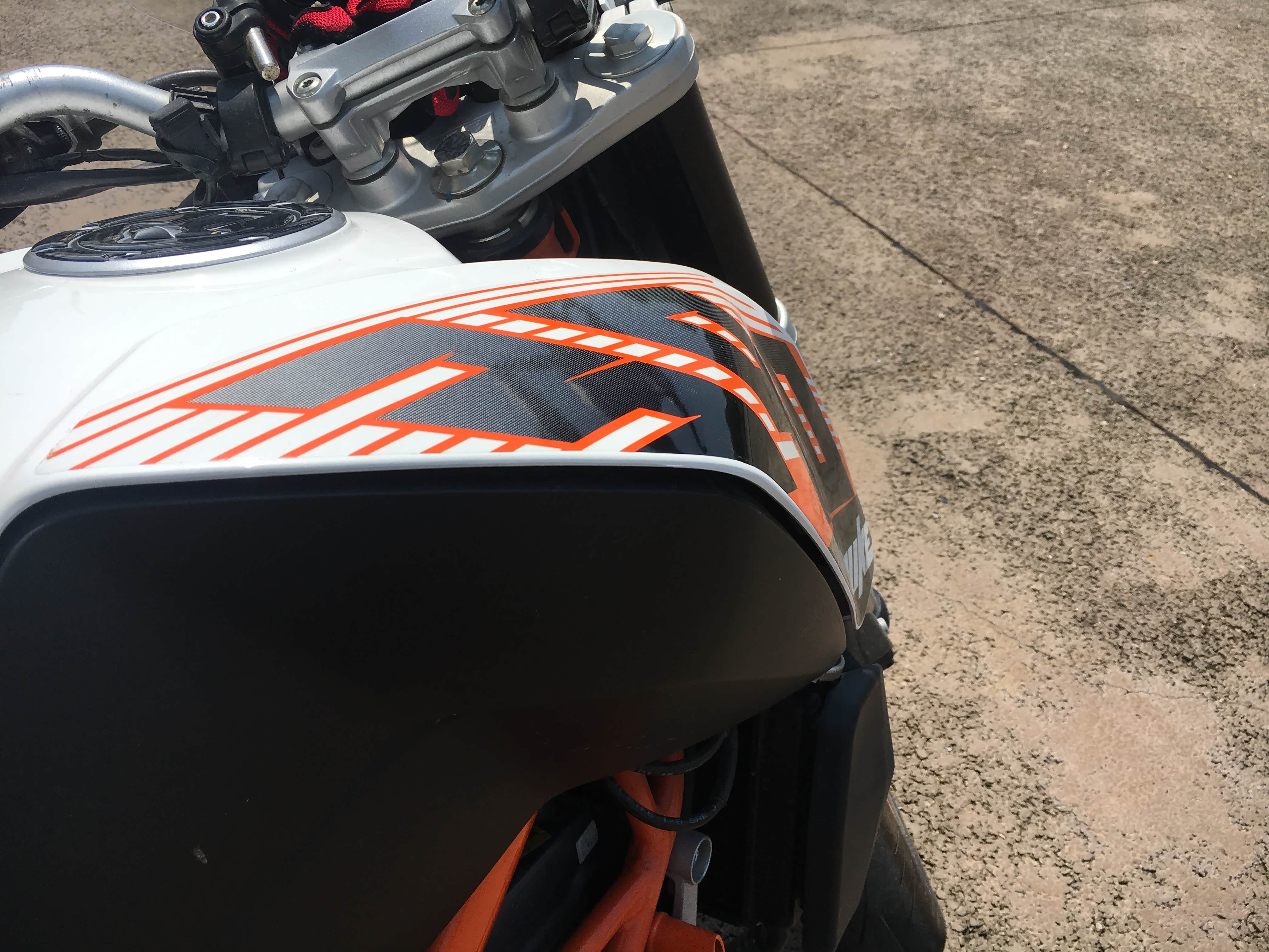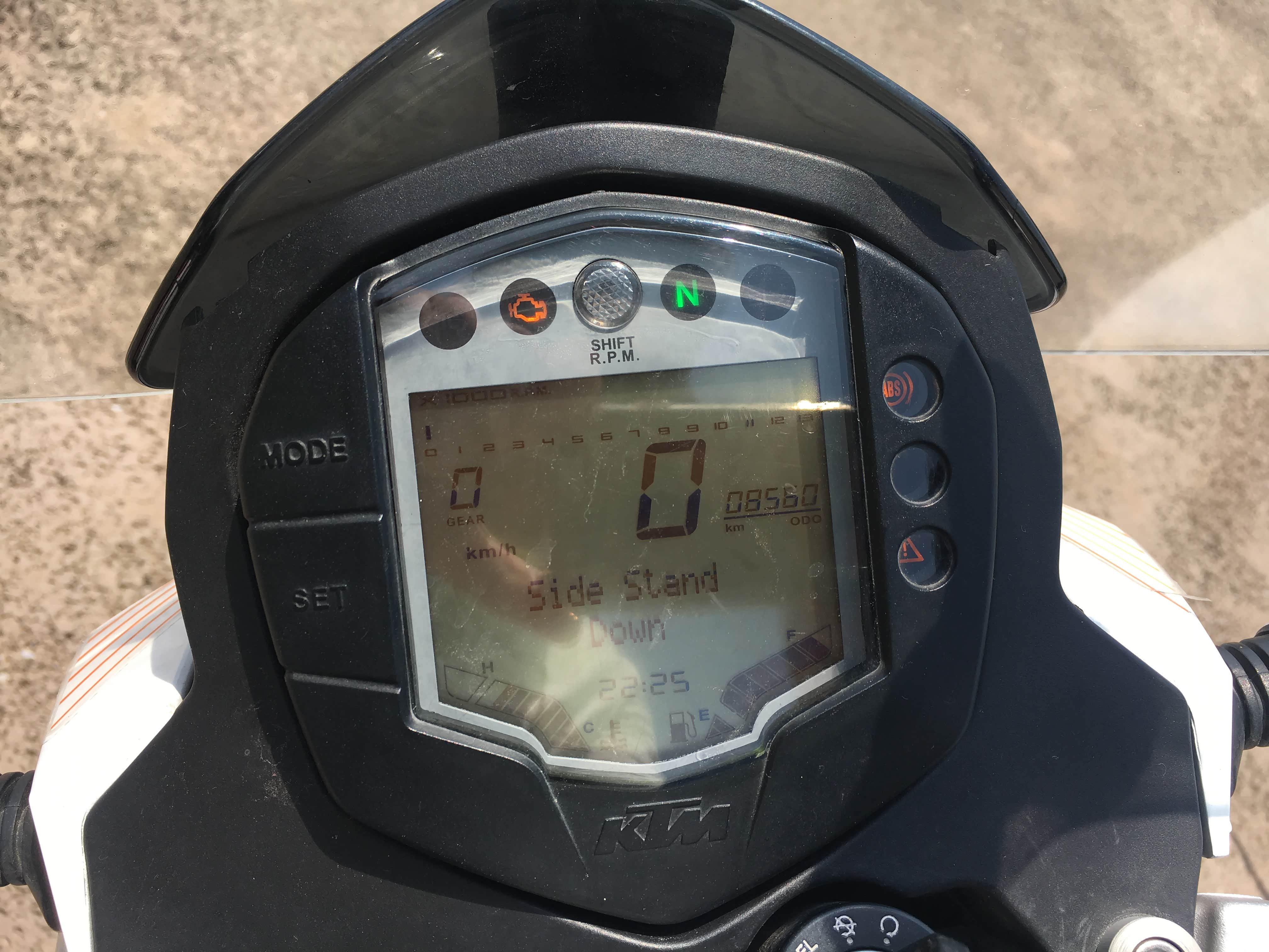 仪表盘还是KTM传统的样式,橙色的底色也能快速分辨出这是台KTM车型,造型设计跟新款390的彩色液晶相比,少了炫酷,但是功能一点不含糊,挡显、转速、时速、ABS、模式、设置、水温、油量等等应有尽有,已经满足所有需求,除此之外,还可以通过仪表盘查看平均时速,油耗,每升油可跑公里数等等。
