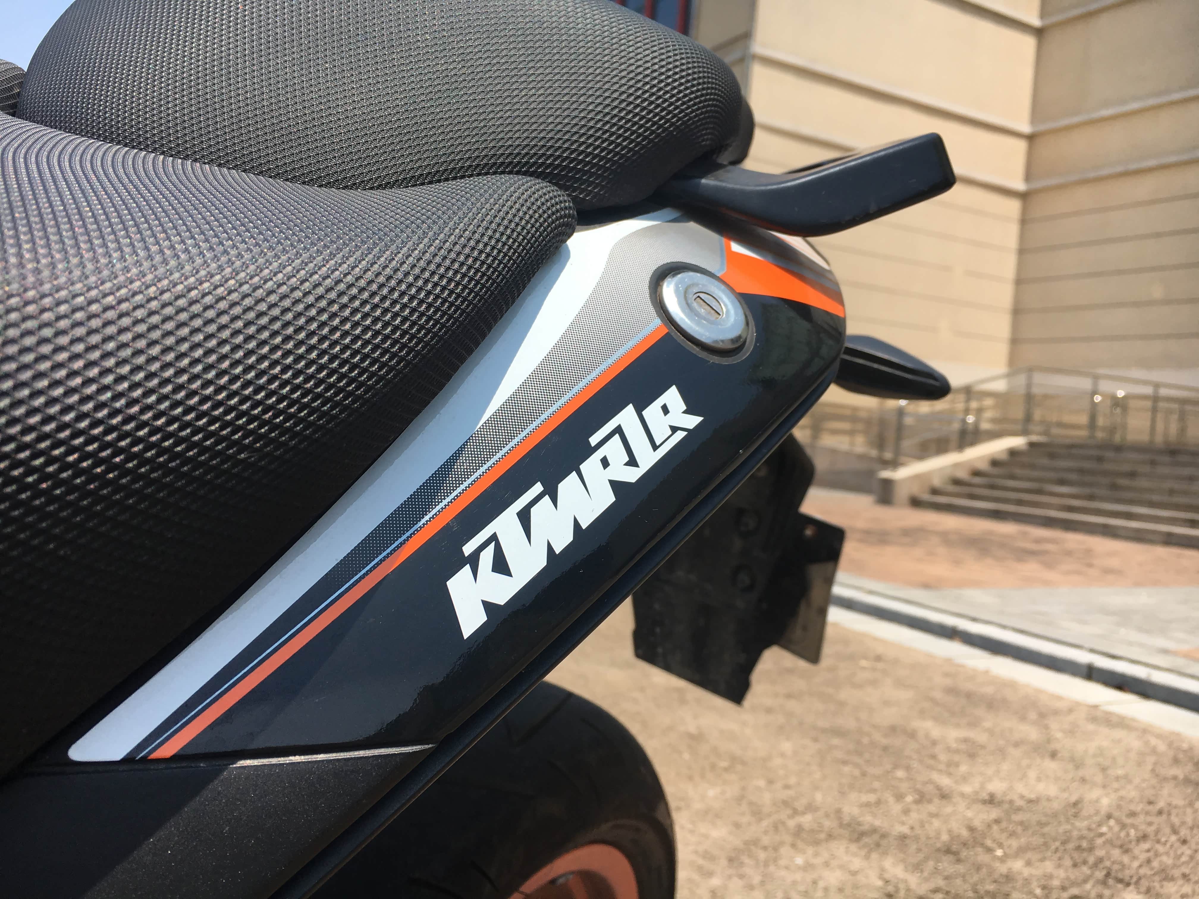 DUKE390的坐姿整体来说微微前倾,座椅高度为800mm,小编身高173cm,两脚前脚掌着地没有问题。正常行驶腰部的酸疼感并不明显,夏天唯一难受的就是发热,骑行一个多小时,基本就湿透了。座椅的填充并不算软和,不过悬架的调校并不算太硬,保持了一定的支撑性能但同时舒适性还可以接受。
