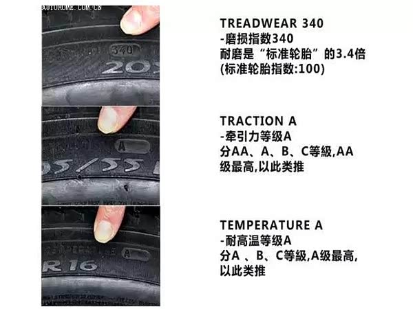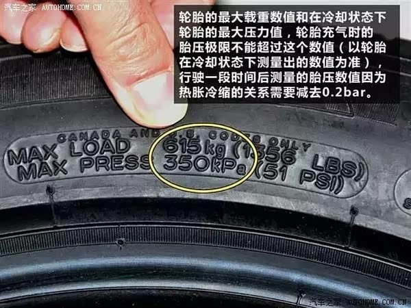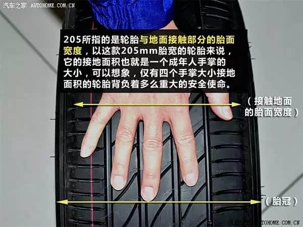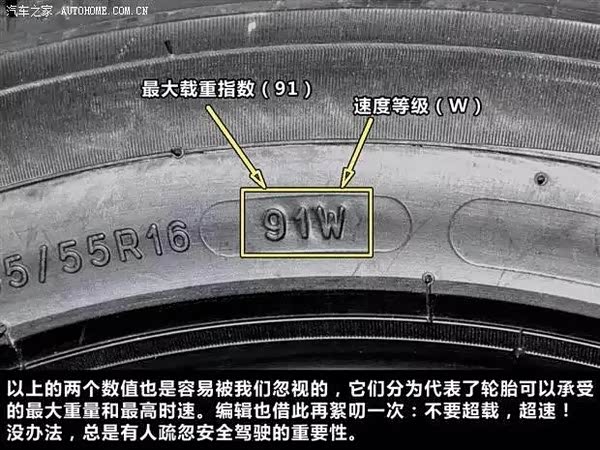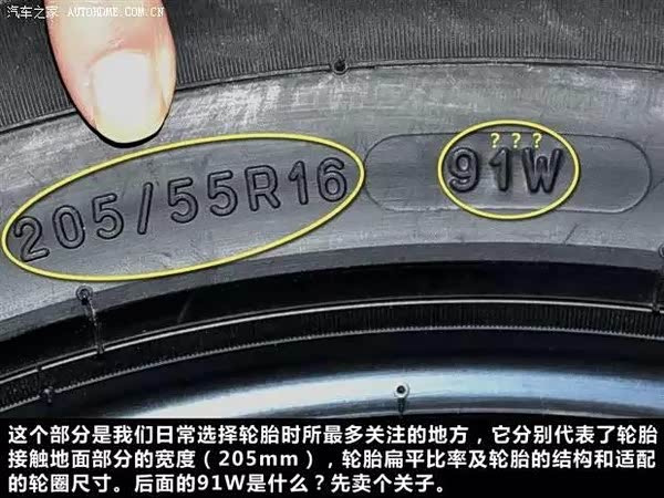 轮胎的规格用一组数字加字母表示,印在轮胎的侧面。第一个数字表示轮胎宽度,第二个数字代表扁平比,第三个是字母,表示轮胎结构,接下来的数字指的是轮辋直径;最后的一个数字一个字母,分别代表载系数和速度级别。