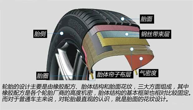 钢丝带束层,是由两层钢丝层叠加而成,两层钢丝层的钢丝成一定夹角,它的作用是提高胎面刚性,使轮胎能应对各种凹凸不平的路面冲击。为防止钢丝锈蚀生锈,在钢丝层外面会有一层覆盖层来让钢丝保持密封状态。然后是胎体帘子布层,它贯穿了整个轮胎的截面,整个轮胎内部都有一层胎体帘子布层,作用是增加轮胎的强度,给轮胎提供更好的支撑性。内部是气密层,位于轮胎内部延伸到轮胎的胎圈位置,主要起密封作用。