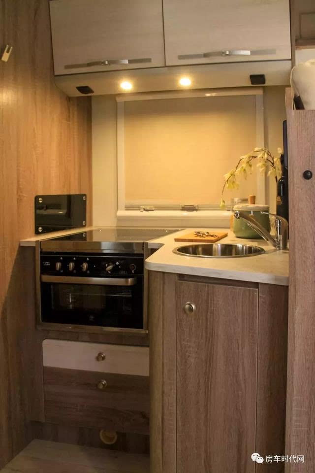 外接燃气接口、整体式橱柜、不锈钢洗菜盆、塞特福德房车专用冰箱、烤箱燃气灶一体机、冷热水龙头