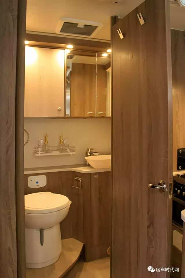 抽拉式房车专用坐便器、120L净水箱、90L污水箱、干湿分离卫浴间、手动卫生间天窗、卫浴间淋浴器、整体吸塑淋浴间、卫浴间小四件套