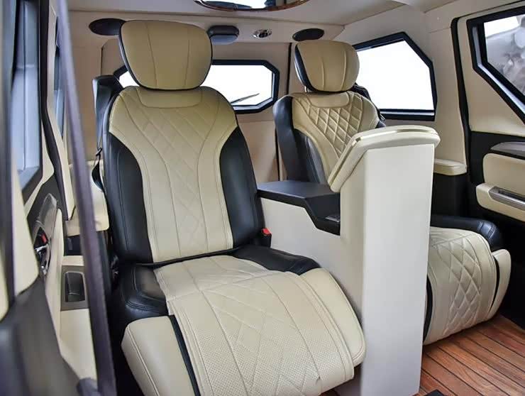 车身侧面,防弹车将原货厢处改为了普通客厢,看起来有着硬派suv的作风。六边形的窗户搭配比之的线条与造型别样的轮圈,开出去基本上就是一个军车级别的回头率。当然,该车采用的是防弹钢板,玻璃则是双层防弹玻璃,可以防范国内外常用的枪支近距离的射击。车身尾部竖状的LED尾灯造型十分别致,内部结构也很精致。
