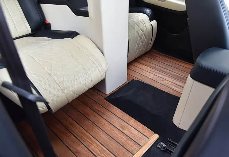 除此之外比较夸张的是在后排车顶有着一个类似于镜子的存在,这个可以提供氛围灯,大概就相当于九十年代迪厅大厅中央挂的旋转球形灯。后排的“地面”则是被安上了木纹地板,可以说是给“大老板们”最极致的舒适体验了,就差一个小酒柜了。