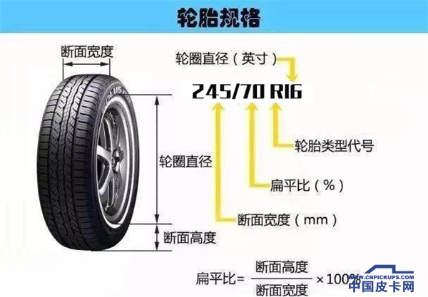 70是扁平比,即轮胎断面高度占其最大宽度的百分比,简单来说就是轮胎断面高/宽x100%。70代表70%,以245/70 R16的轮胎为例,该轮胎的断面高度为245*70%=171.5(mm),皮卡轮胎的扁平比以65%、70%较为常见。扁平比越小,轮胎越扁,反馈给皮卡的路感越强,操控性越好,但是会显著的影响乘坐舒适度。