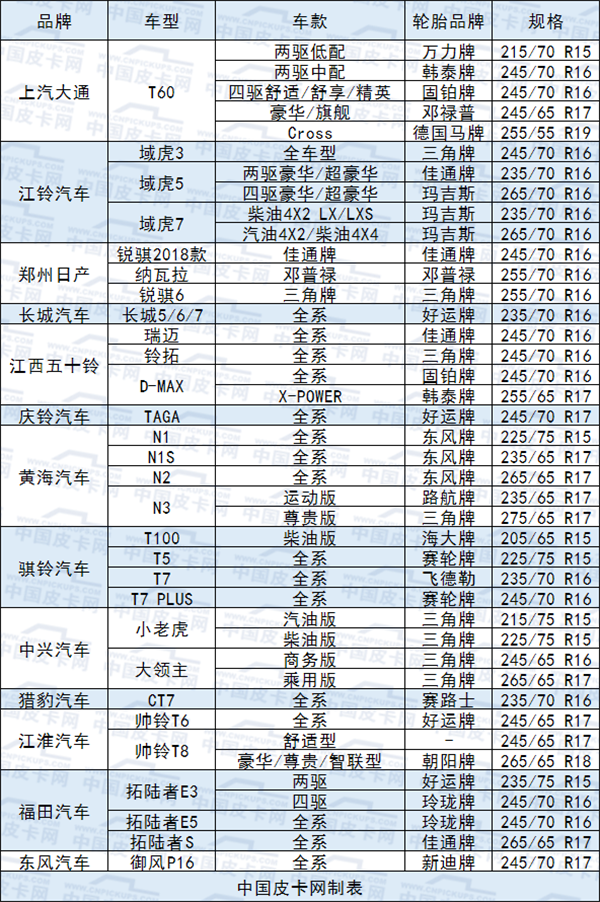 事实看来笔者还是多虑了,能让砖叔做出如此梦幻的漂移动作,除了野蛮的动力,汽车的轮胎质量也功不可没。作为汽车与地面唯一直接接触的部件,轮胎的重要性不言而喻,相信也有非常多的朋友正在面对轮胎方面的问题。下表是我们统计出国产皮卡采用的轮胎品牌与型号,更多关于轮胎的知识且听笔者细细道来。