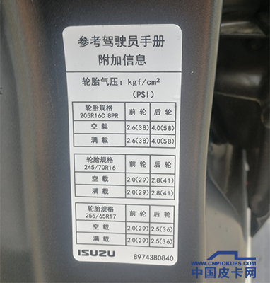 轮胎气压检查必须在轮胎处于完全冷却的状态下进行,可以使用轮胎气压表或者TPMS胎压监测。TPMS在如今很多中高端皮卡车型上都可进行选装。皮卡的车辆使用手册上都会列明车辆各种负载状态下的标准胎压,同时该参数也会在驾驶员车门处的标签处列明。